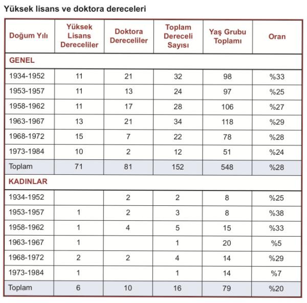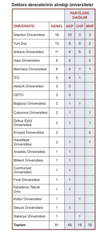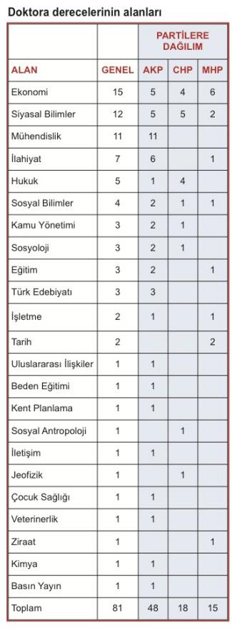 Milletvekillerinin 152'si, yani ('i yüksek lisans ve doktora derecesine sahip. Yüksek lisanslı milletvekili sayısı 71. Doktoralı milletvekili sayısı 81. -