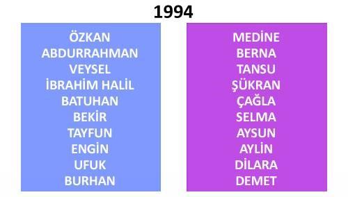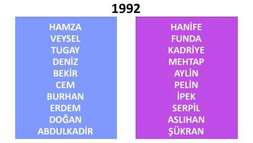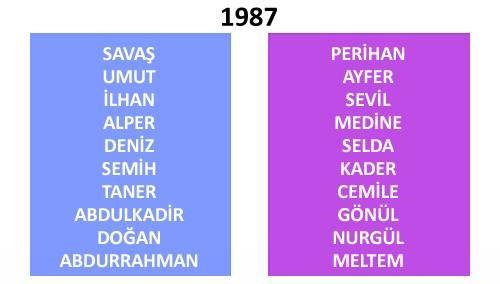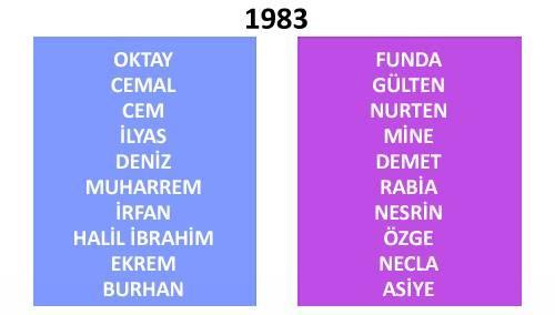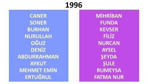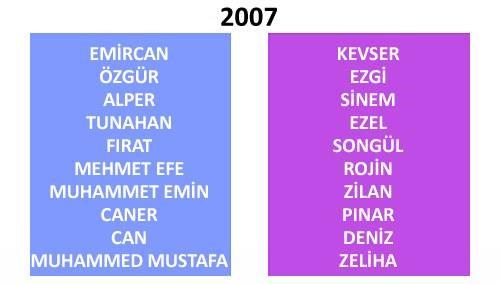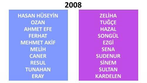 ADNKS (Adrese Dayalı Nüfus Kayıt Sistemi) verilerine göre 1950 - 2012 yılları arasında yeni doğmuş bebeklere verilen en çok isimden ilk 100 sıralaması yapıldı.