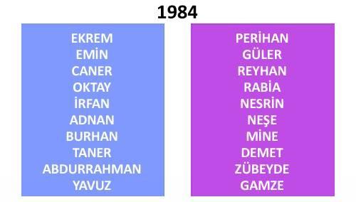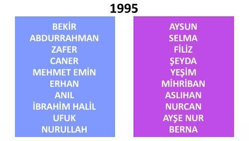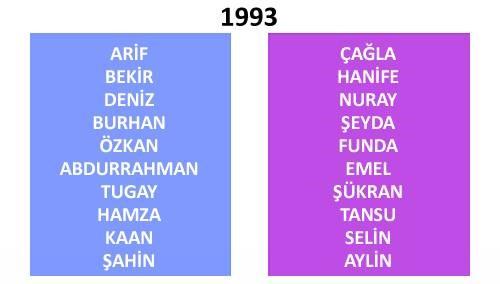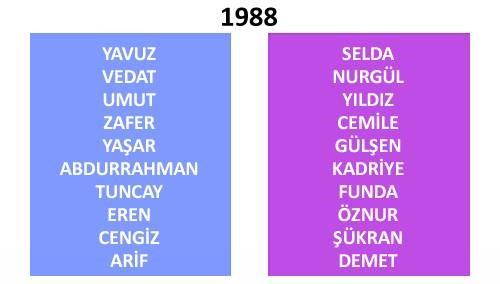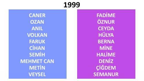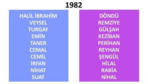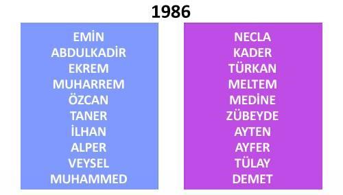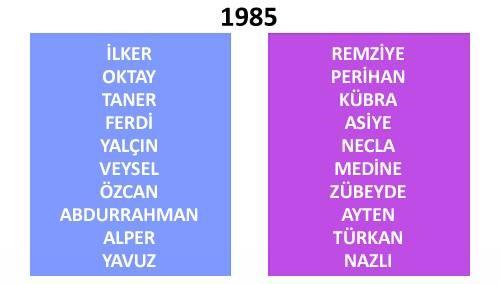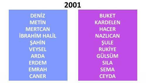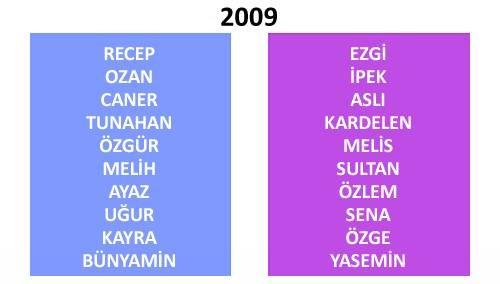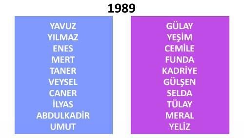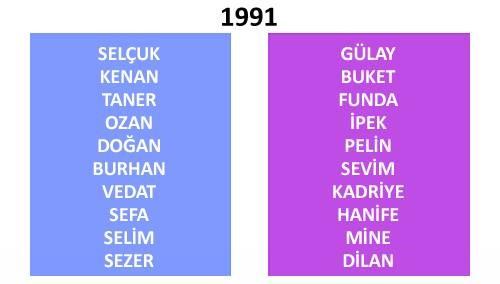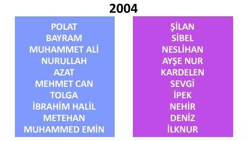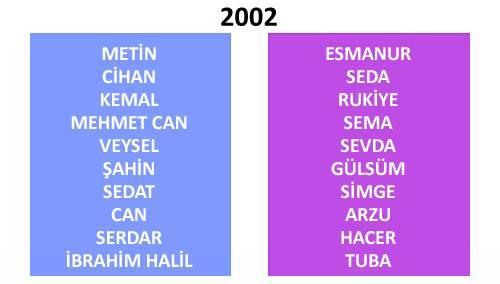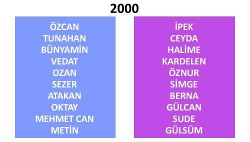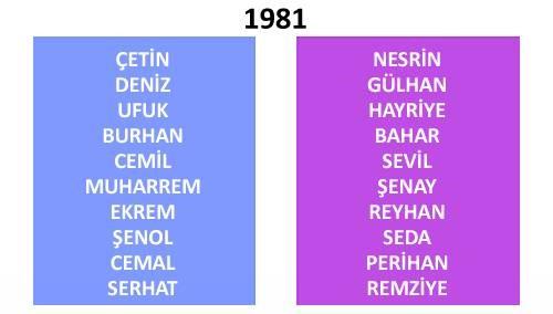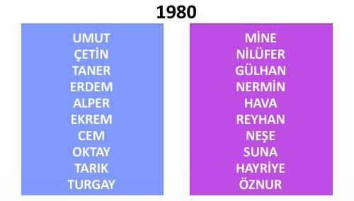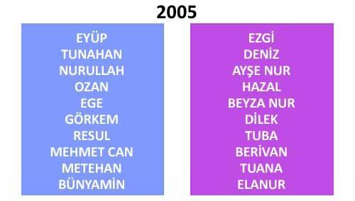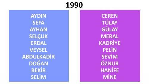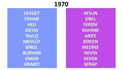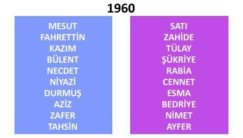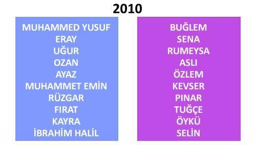 2010 ADNKS (Adrese Dayalı Nüfus Kayıt Sistemi) verilerine göre 1950 - 2010 yılları arasında yeni doğmuş bebeklere verilen en çok isimden ilk 100 sıralaması yapıldı. İşte yıllara göre ilk 10'a giren isimler.