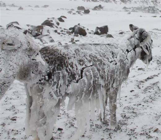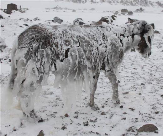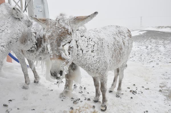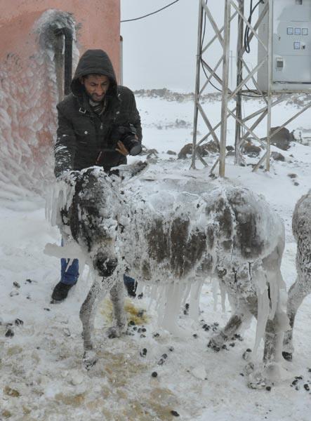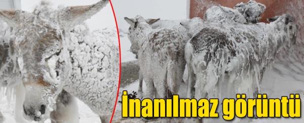 Köyün 1 kilometre dışındaki boş alanda soğuktan korunma içgüdüsüyle birbirine sokulup hareketsiz kaldıkları sanılan eşekler, köylüler tarafından ahıra götürüldü.