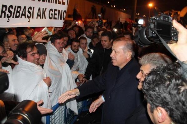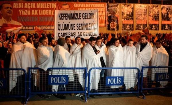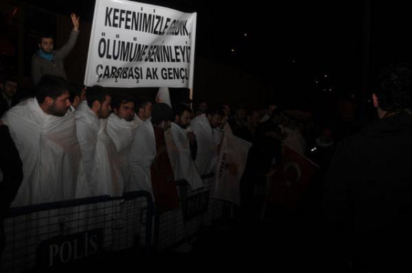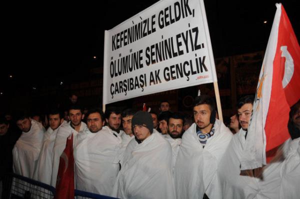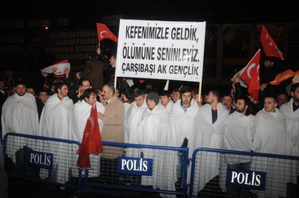 Başbakan Erdoğan'ı Trabzon Havalimanı'nda karşılamaya gelenlerin bulunduğu alana gelen ve üzerlerine kefen giyen Çarşıbaşı AK Gençlik tarafından "Kefenimizle geldik, ölümüne seninleyiz" yazılı pankart açıldı.