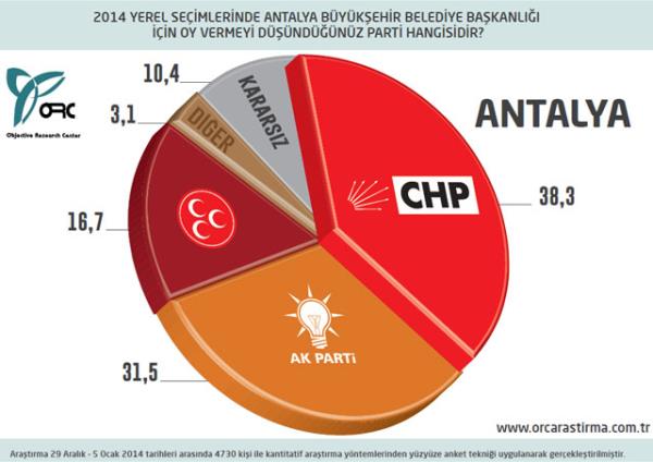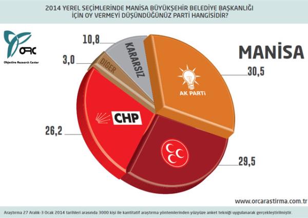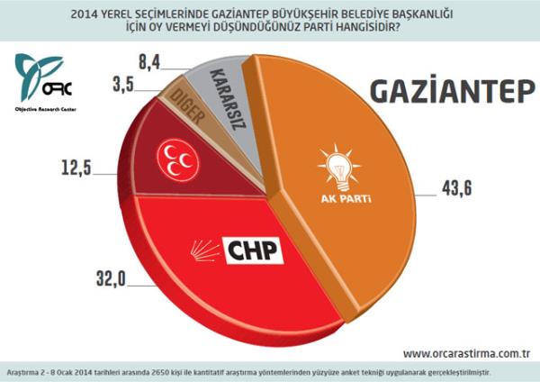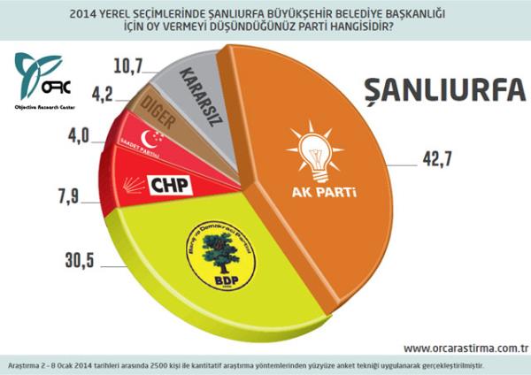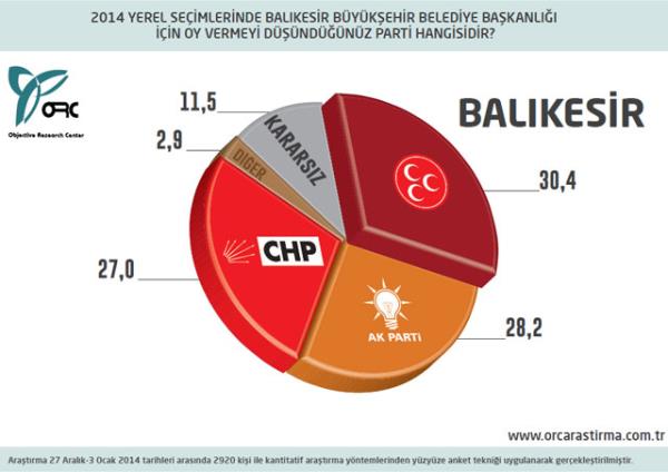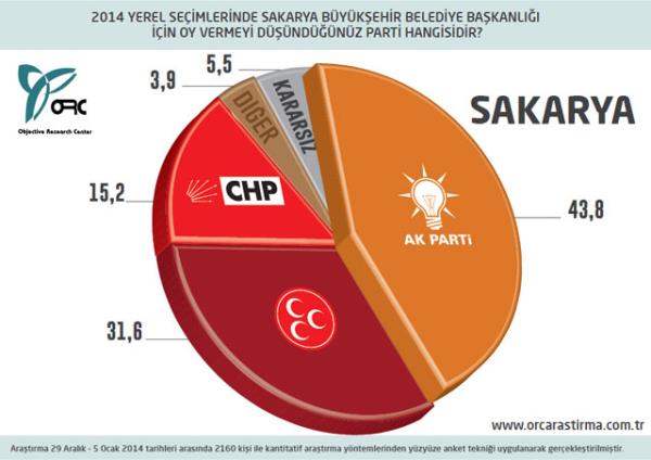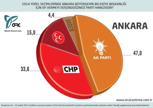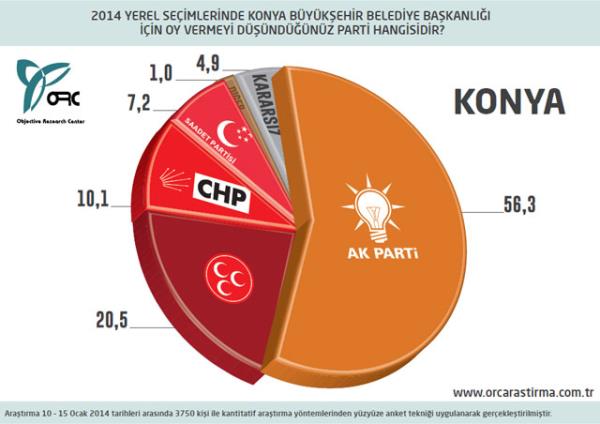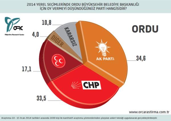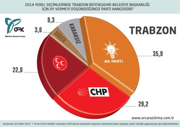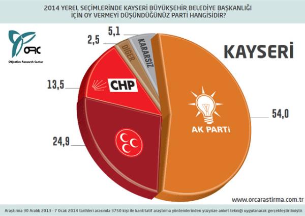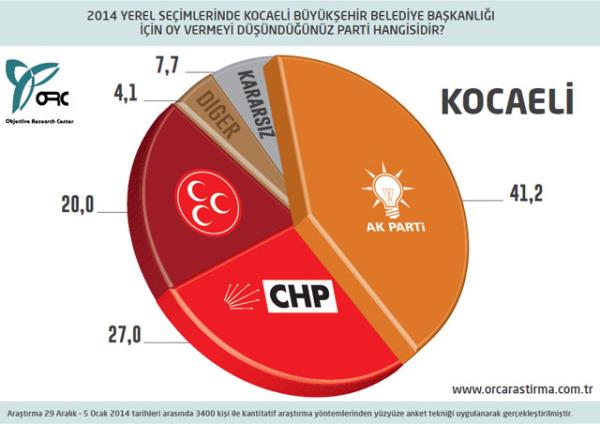 ORC Araştırma Şirketi tarafından 30 büyükşehirde yapılan yerel seçim anketinden çarpıcı sonuçlar çıktı. ARAŞTIRMANIN AMACI Bu araştırmanın amacı; 2014 yerel seçimleri öncesinde Büyükşehirlerde seçmenlerin siyasi parti tercihlerini tespit etmek ve kamuoyu ile paylaşmaktır. ARAŞTIRMANIN TARİHİ Bu araştırmanın saha uygulaması 24 Aralık 2013 – 18 Ocak 2014 tarihleri arasında gerçekleştirilmiştir.