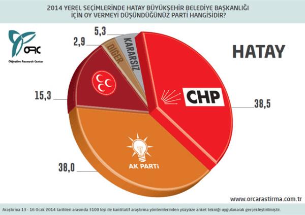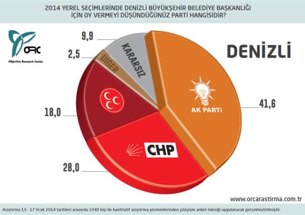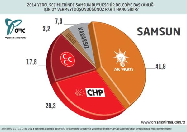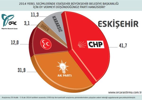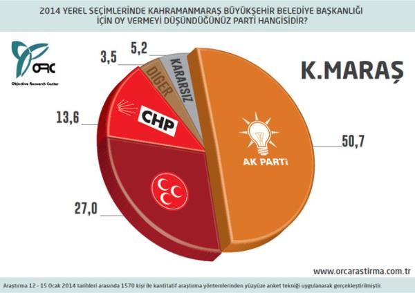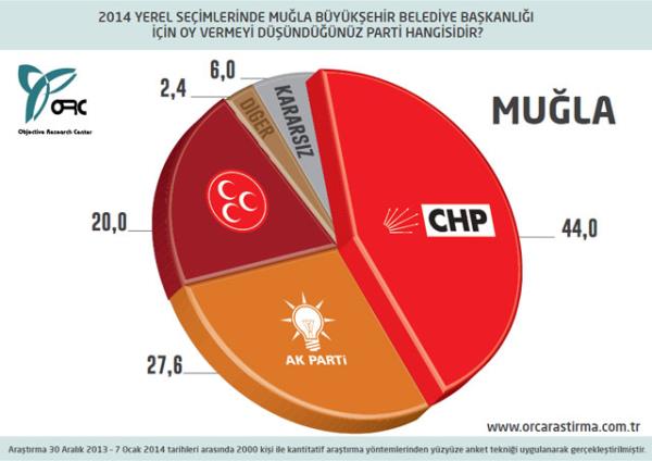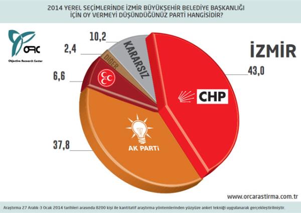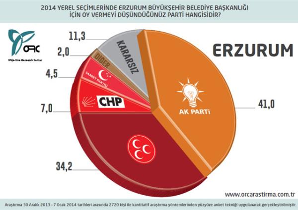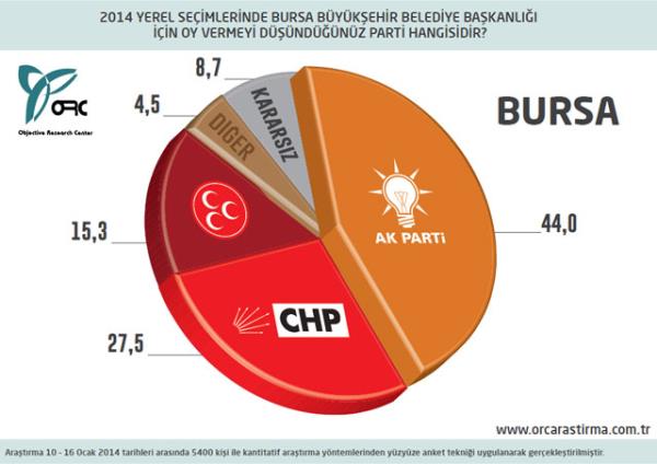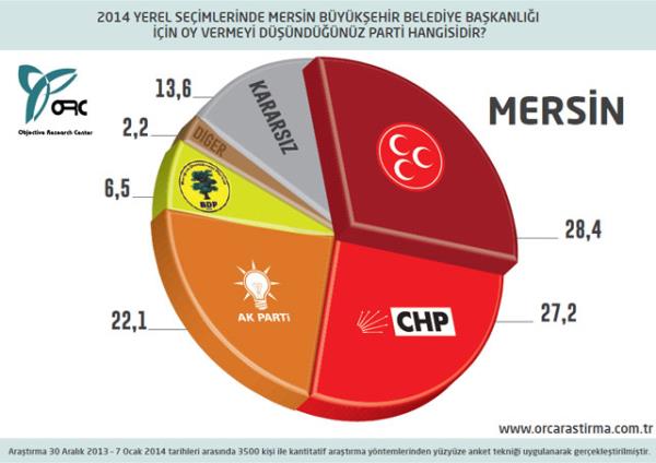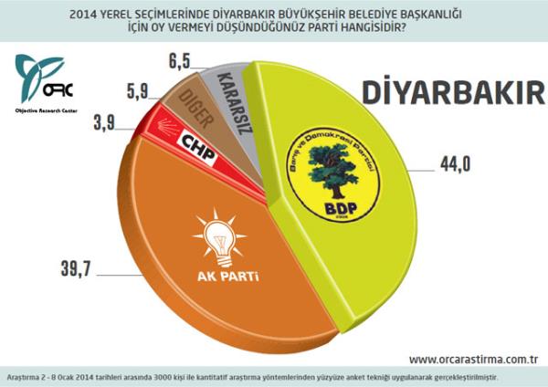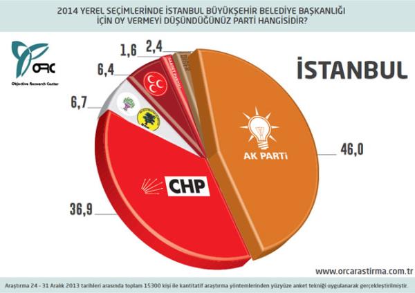 ORC Araştırma Şirketi tarafından 30 büyükşehirde yapılan yerel seçim anketinden çarpıcı sonuçlar çıktı. ARAŞTIRMANIN AMACI Bu araştırmanın amacı; 2014 yerel seçimleri öncesinde Büyükşehirlerde seçmenlerin siyasi parti tercihlerini tespit etmek ve kamuoyu ile paylaşmaktır. ARAŞTIRMANIN TARİHİ Bu araştırmanın saha uygulaması 24 Aralık 2013 – 18 Ocak 2014 tarihleri arasında gerçekleştirilmiştir.