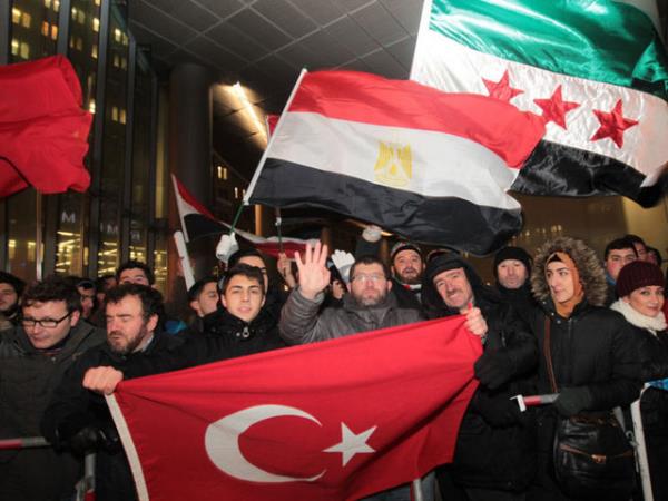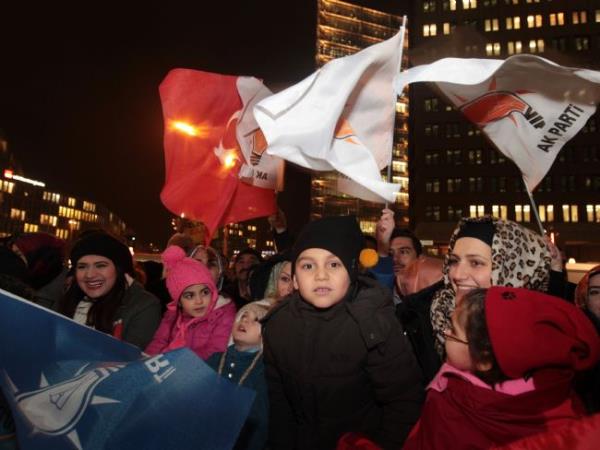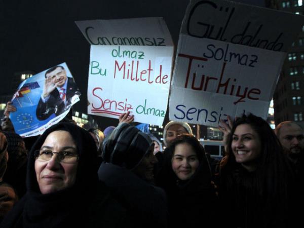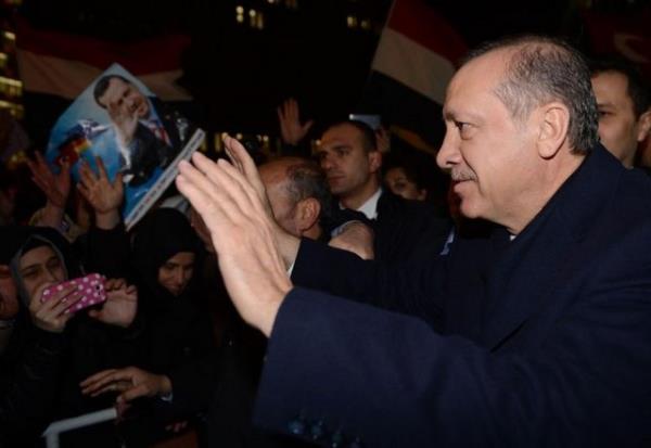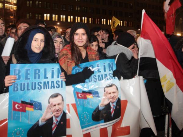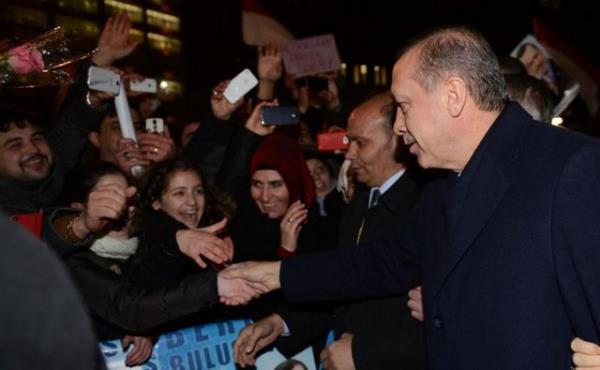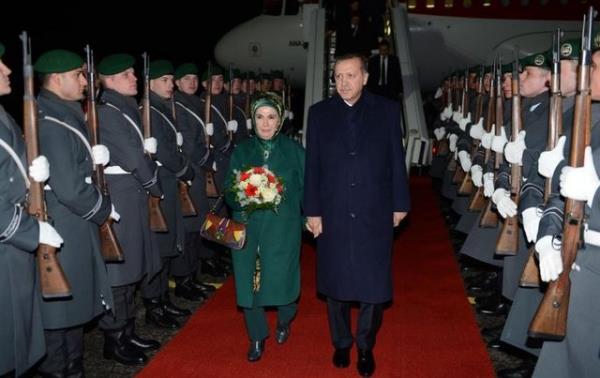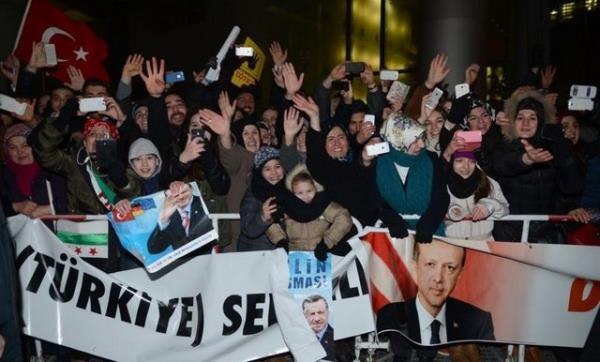 Başbakan Erdoğan, Berlin'de kalacağı otelin önünde toplanan kalabalık tarafından, "Dik dur eğilme, bu millet seninle", "Türkiye seninle gurur duyuyor" sloganlarıyla karşıladı.