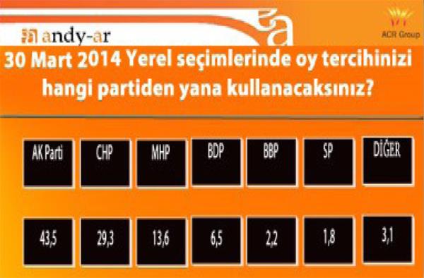 Andy-Ar Araştırma Şirketi 15-25 Ocak 2014 tarihleri aralığında yaptırdığı anketteki yerel seçim sonuçlarını açıkladı. Ankette şu sorulara cevap arandı: