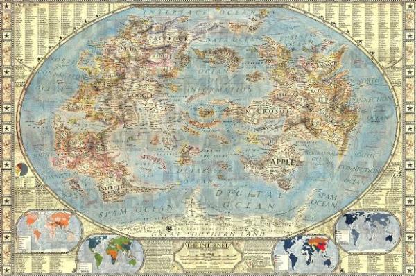 İşte Dünya İnternet Haritası?nın genel görünümü? Kıtalar olur da okyanuslar olmaz mı? En büyük okyanus bu haritada Bilgi Okyanusu adını taşıyor. Dijital Okyanus, Spam Okyanusu, Korsan Denizi, Arayüz Okyanusu gibi sulara da rastlamak mümkün.