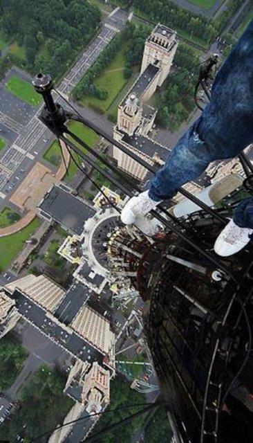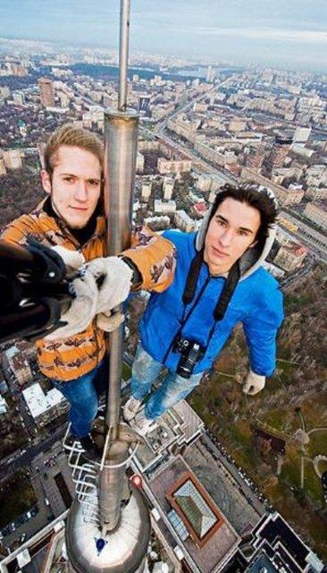 Moskovalı fotoğrafçı ve birkaç cesur arkadaşı yüksek binaların, vinçlerin ve köprülerin tepelerinde durarak, hatta sarkarak poz veriyorlar.