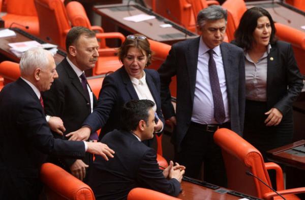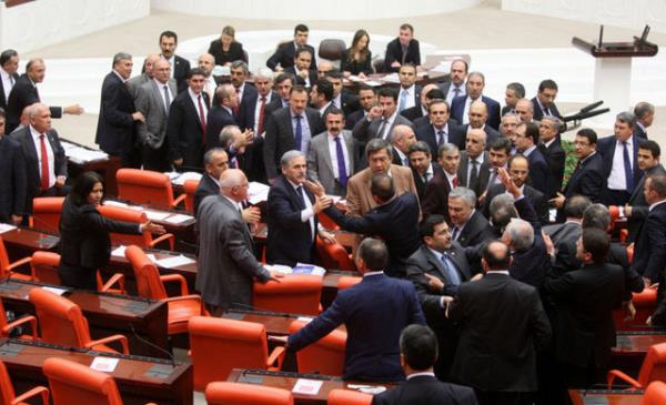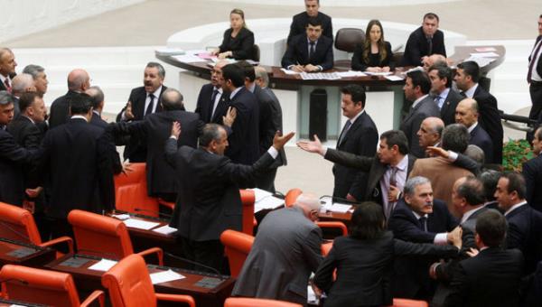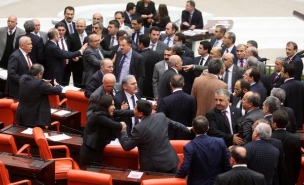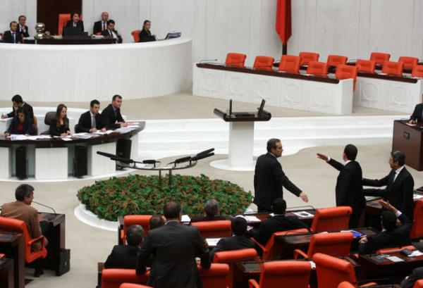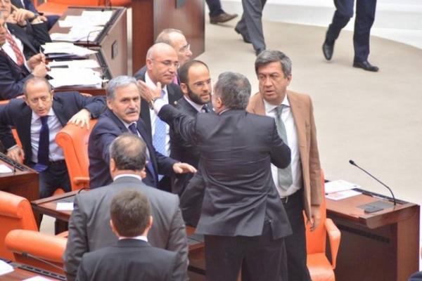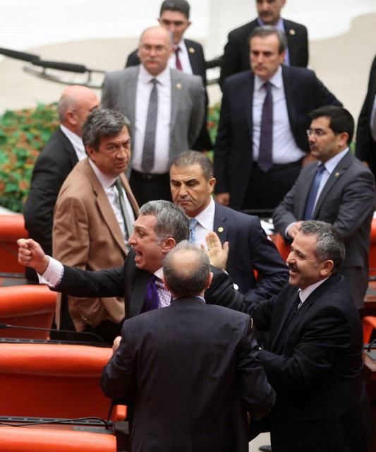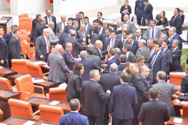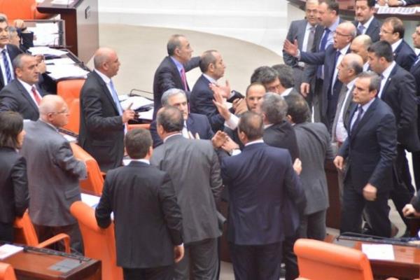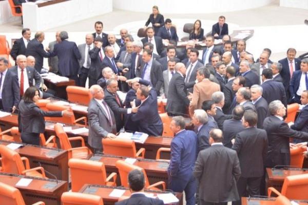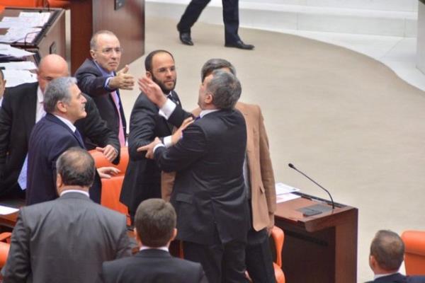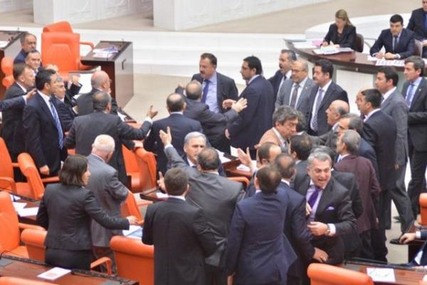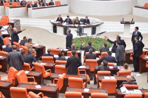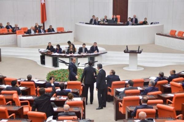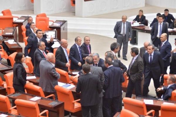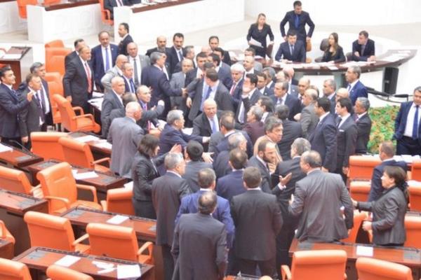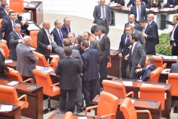 CHP'li Sarı'nın konuşmasına tepki gösteren AK Parti milletvekilleri CHP sıralarına yürüdü. AK Parti ve CHP milletvekilleri arasında yaşanan tartışma, grup başkanvekillerinin araya girmeleriyle sona erdi.