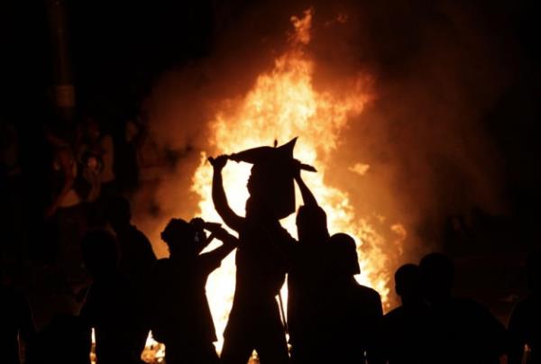 Göstericiler yakıp yıktıkları yerlerde bayraklarla poz vererek Milli bir hava oluşturmaya çalıştı.