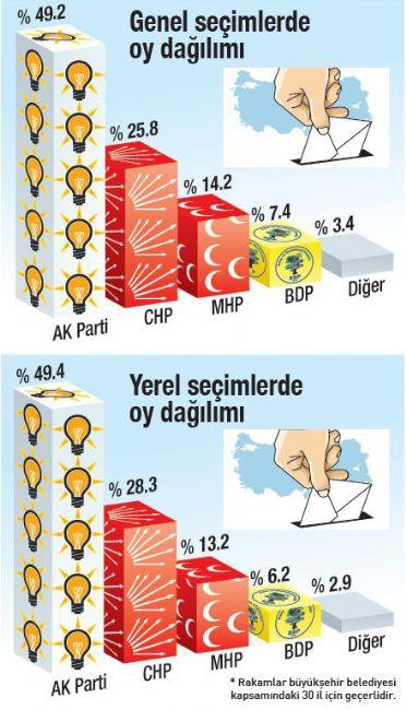 Diğer partilere oy vereceklerin oranı ise yüzde 2.9'da kaldı. Büyükşehir statüsü dışında kalan illerde de durum farklı değil. AK Parti'nin oyları yüzde 49. CHP'nin yüzde 14.9, MHP'nin yüzde 22.6, BDP'nin yüzde 2, diğer partilerin ise yüzde 11.7 oy alması bekleniyor.