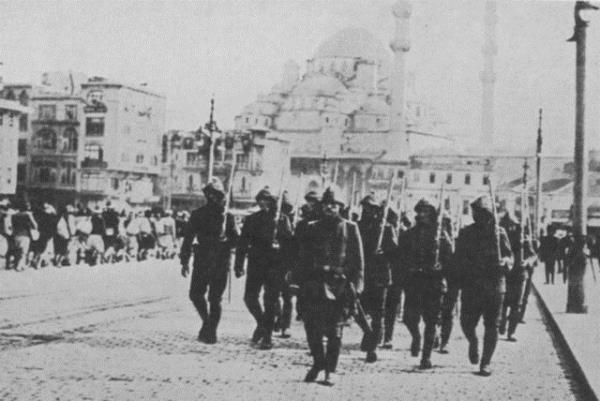 Boğazı işgal etmeye çalışan İngiliz gemilerini izleyen Türk askerleri