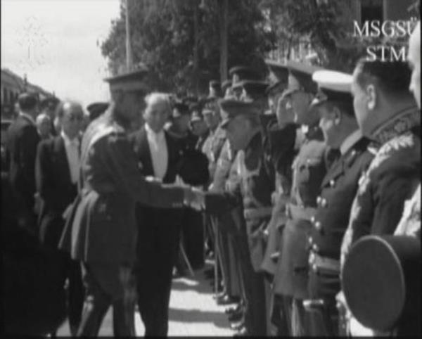 Arşivde bulunan bir başka görüntüde ise Atatürk, Türkiye Cumhuriyeti'nin ilk Başbakanı İsmet İnönü ve beraberindeki heyet İran Şahı Rıza Pehlevi'yi istasyonda karşılıyor.