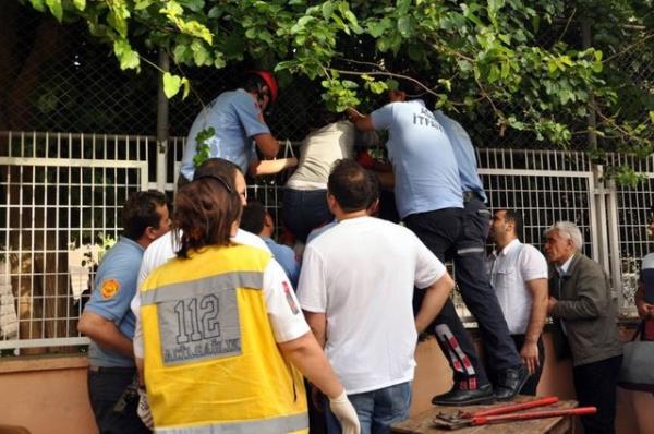 Adana'da bir okulun bahçesinden kızına dut toplarken dengesini kaybederek düşen kadının koluna korkuluk demiri saplandı.