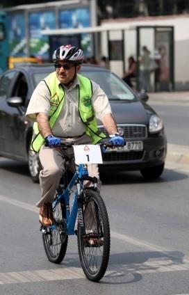 Fotoğrafta Sağlık Bakanı Mehmet Müezzinoğlu, sahilde başkasından ödünç aldığı bisiklete binerken görülüyor.