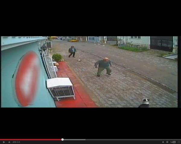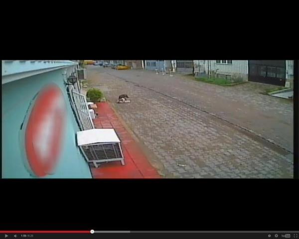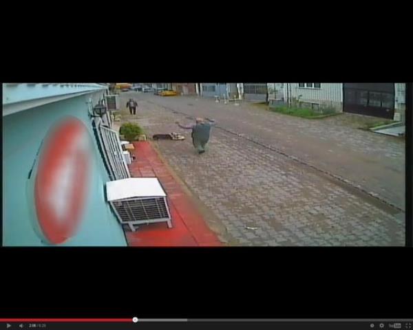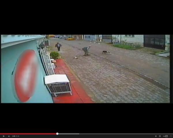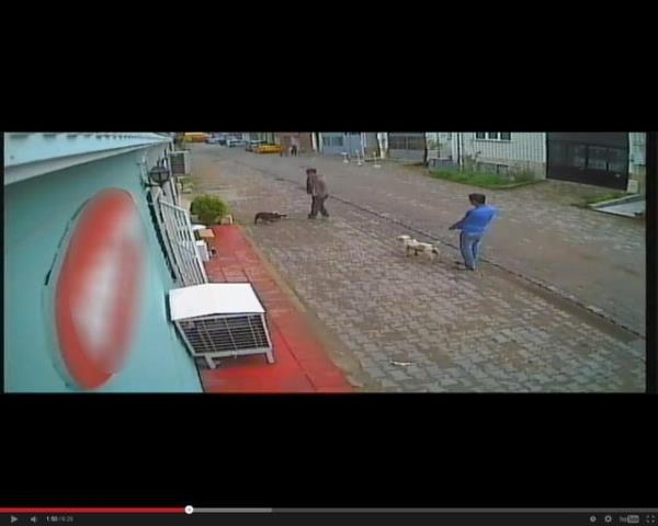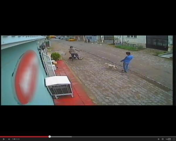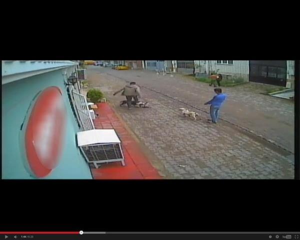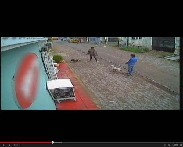 Tasmasız olarak dolaştırılan köpeklerden biri gördüğü kediye saldırdı. Köpek kediyi parçalarken iki genç olanları seyretti. Olayı gören bir kişi ise hemen köpeği tekme atarak etkisiz hale getirdi.