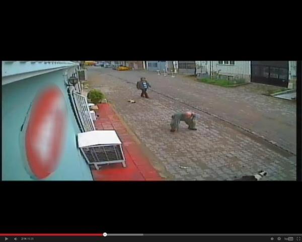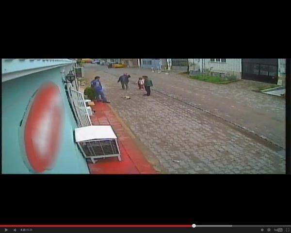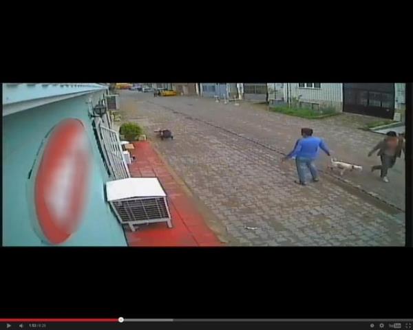 Ellerinde iki Pitbull olan kimliği belirsiz, ikili köpeklerden birini tutarken diğerini bir kedinin üzerine salıyor. Pitbull, kediyi parçalamaya başlarken ikili, seyrediyor.