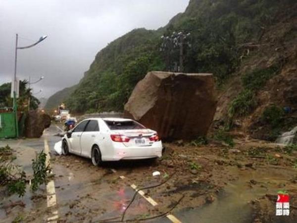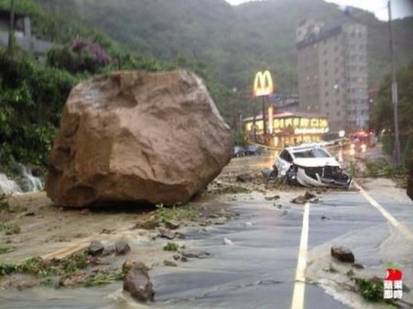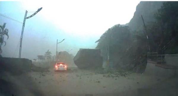 Heyelan sonrası bir araç, çarpan kayalar yüzünden hasar alırken asıl sonuç ise toz bulutu ortadan kalktıktan sonra görülüyor.