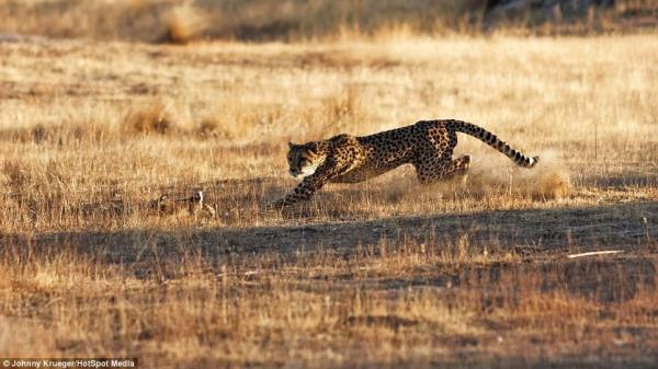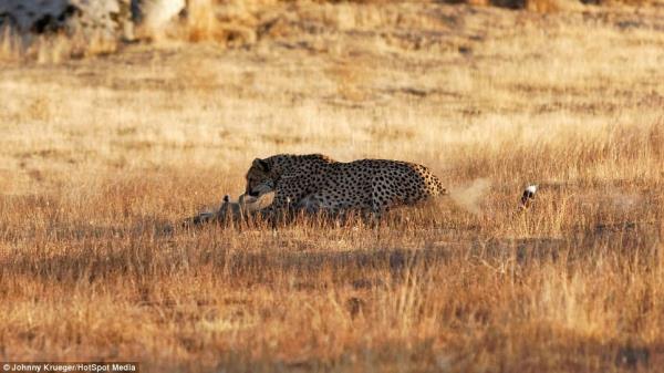 En sonunda tavşan bitkin düştü ve çitanın tek bir darbesiyle yere düşüp ona av oldu.
