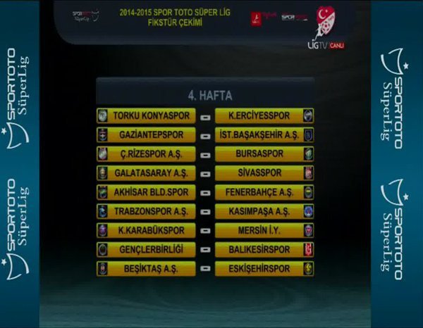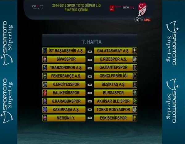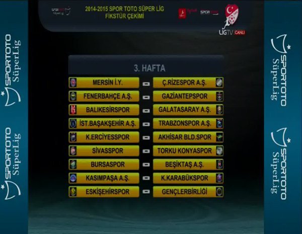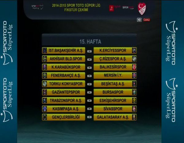 Spor Toto Süper Lig?de 2014-2015 sezonu fikstürü çekildi. Spor Toto Süper Lig'de 2014-2015 sezonu 29-31 Ağustos 2014'tebaşlayıp, 31 Mayıs 2015'te sona erecek. İşte 2014-2015 sezonunda oynanacak karşılaşmalar...