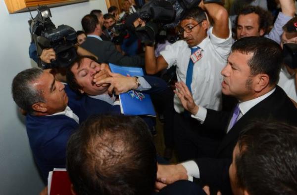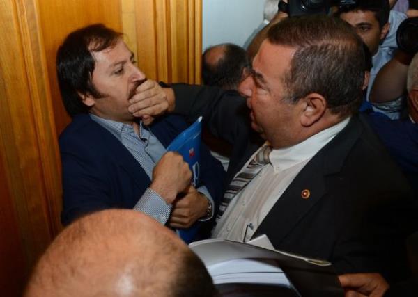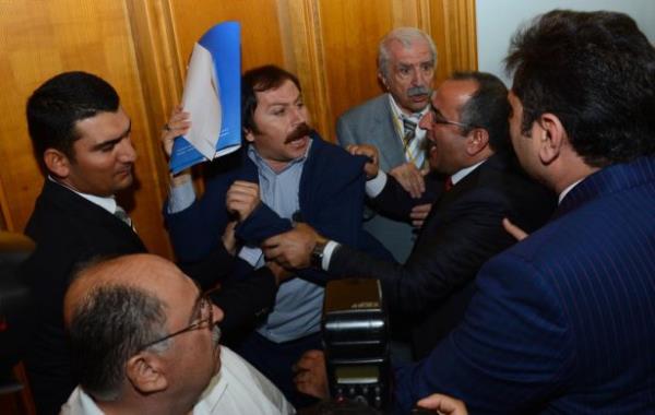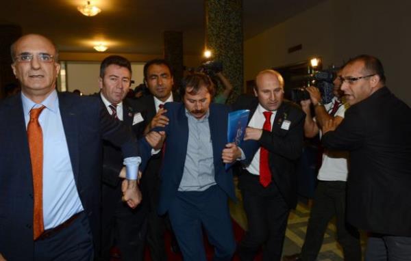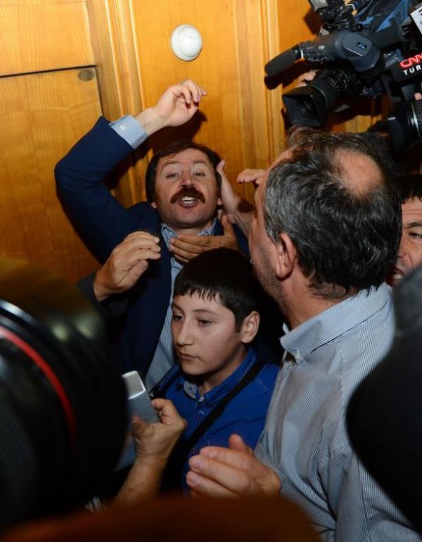 CHP'nin TBMM'deki grup toplantısının sona ermesinin ardından, Samsun Asarcık İlçesinin eski CHP İlçe Başkanı Bülent Baskın, CHP Başkan Kemal Kılıçdaroğlu'na tepki gösterdi. Bazı partililer de Baskın'a tepki gösterince arbede yaşandı. Meclis polisi, Baskın'ı (sağda) grup toplantısının yapıldığı yerden uzaklaştırdı.