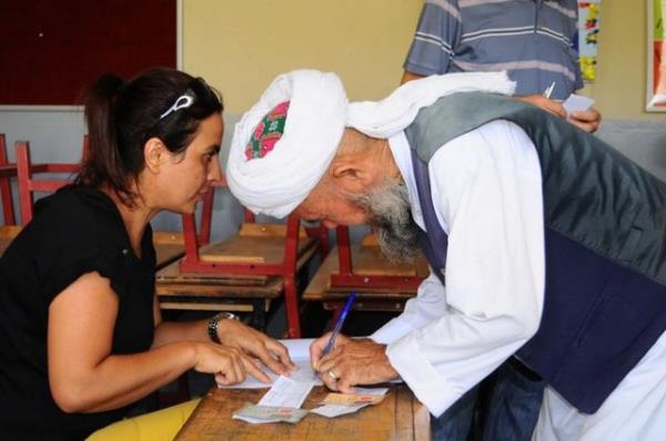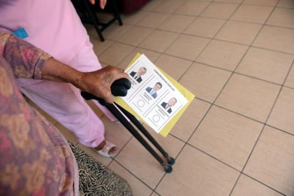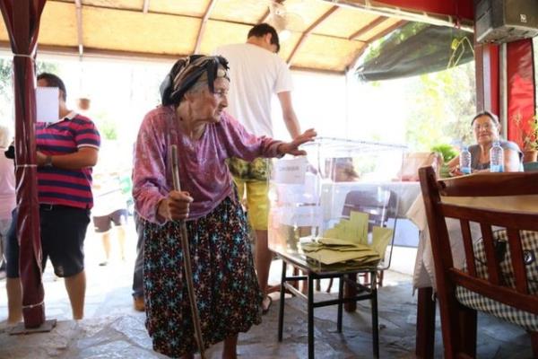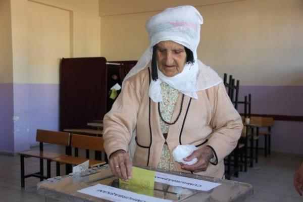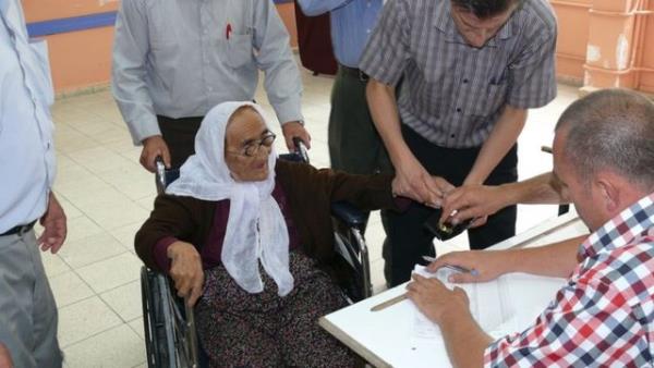 Çanakkale'nin Ayvacık ilçesine bağlı Küçükkuyu beldesinde yaşayan ve cumhurbaşkanı seçimi için 78 yaşındaki Gülsüm Kuru ilerlemiş yaşına ve ayaklarındaki rahatsızlığa rağmen oğlu ve damadıyla bir dayanak sayesinde oy kullanmaya geldi.