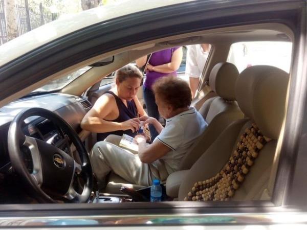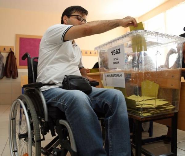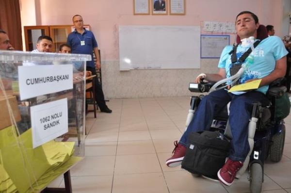 Münevver Küçükertunç, ameliyatının ardından yakınları tarafından oy kullanmaya sandalyeyle getirildi.