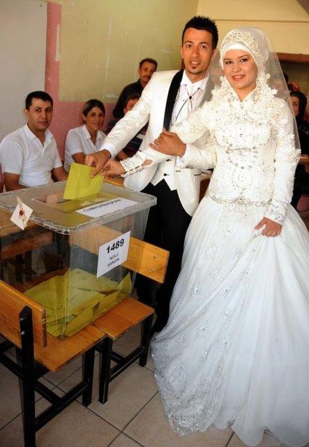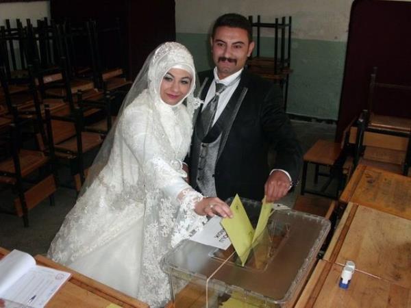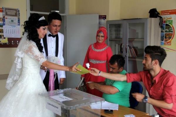 Sivas'ın Hafik ilçesinde damat Okan Özbek (22) ve gelin Ayşe Çaldıran (19) çifti en mutlu günlerinde cumhurbaşkanı seçiminde oy kullandı. Gelin adet gereği yüzünü ilk eşi göreceği ve yüz görümlüğü alacağı için kırmızı duvağını açmadan oy kullandı.