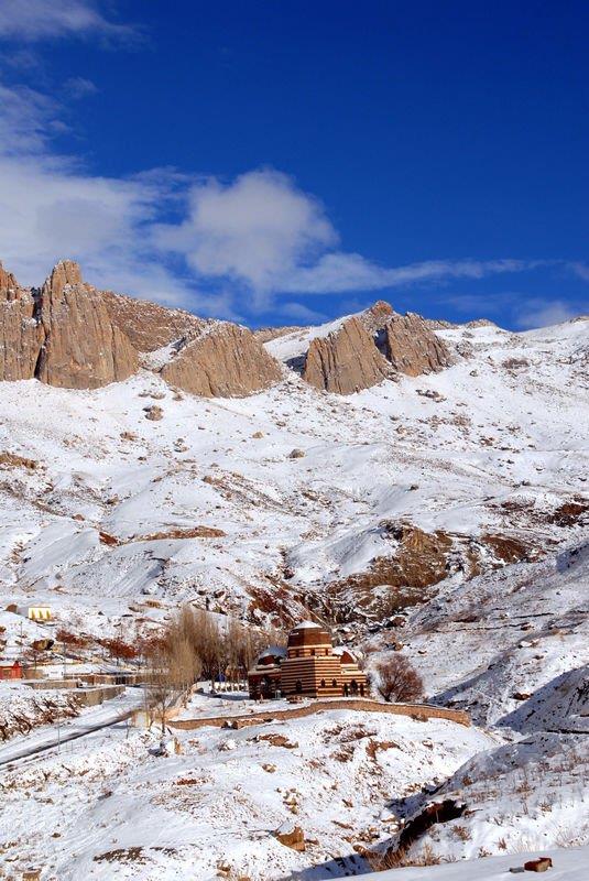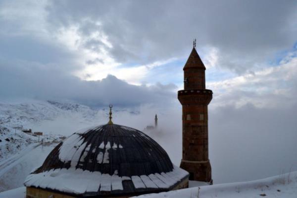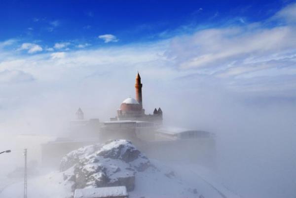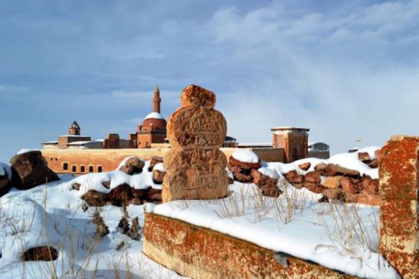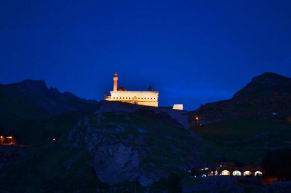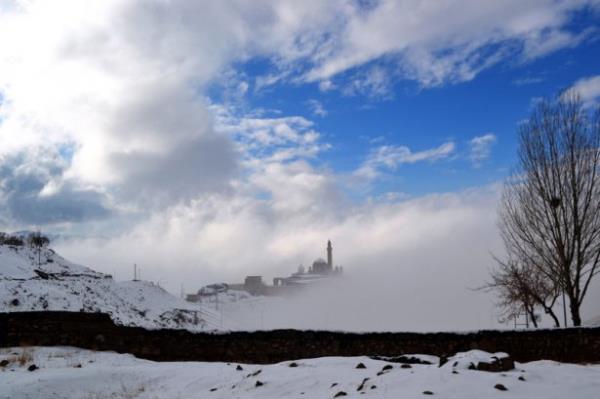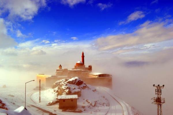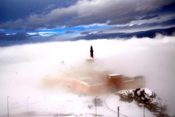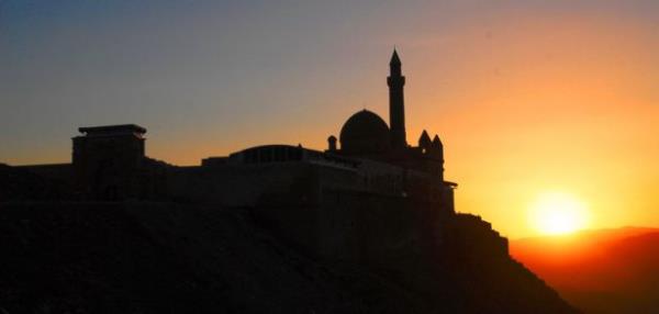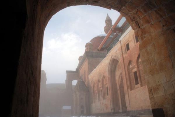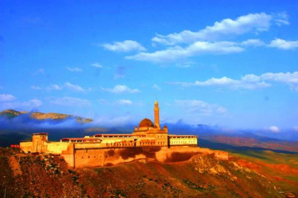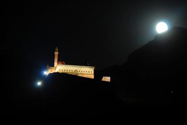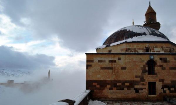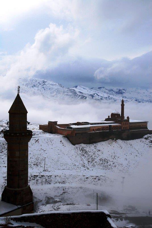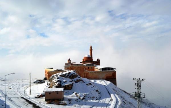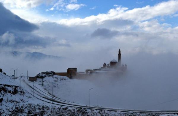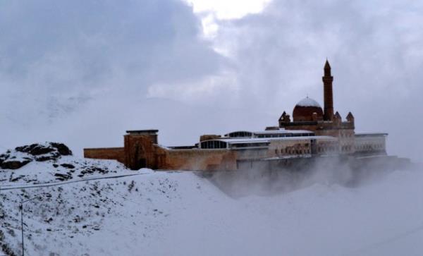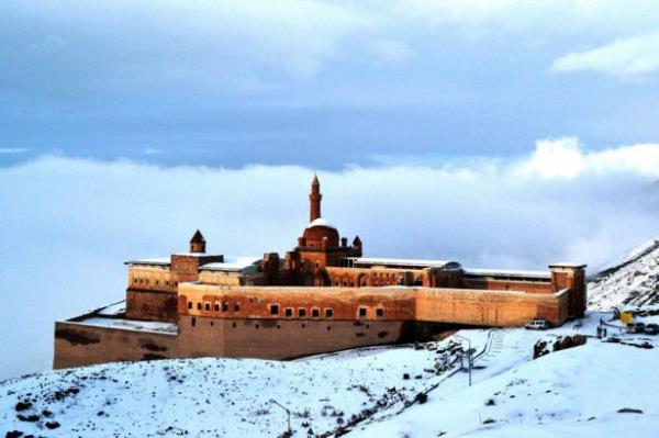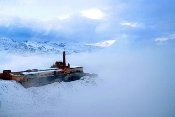 Doğubayazıt ilçesinde, kartal yuvası görünümü, mimarisi ve tarihsel özelliğiyle Doğu Anadolu Bölgesi'nin önemli yapılarından biri olan İshak Paşa Sarayı, her mevsim ayrı bir güzellikle ziyaretçilerini ağırlıyor.