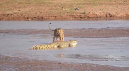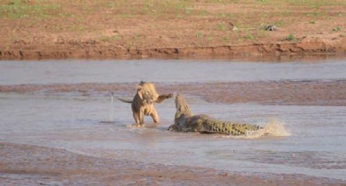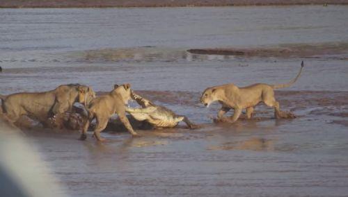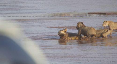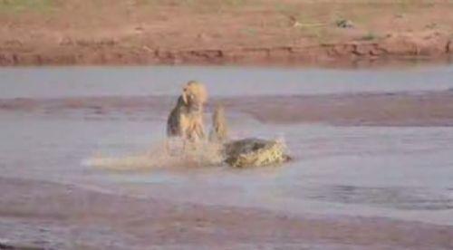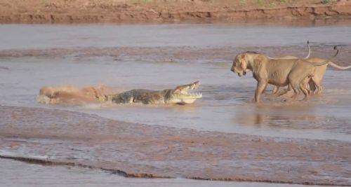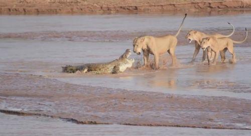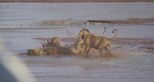 Timsahın güçlü sert çenesi aslanlara kolay lokma olmayacağını gösterir. Aslanlar yavaş yavaş timsahı suyun içinde sağa sola çeviriyor. Aslanlar yorgun halde pes edip mücadele sona erdiğinde timsah yaralanmış halde kenara çekiliyor.