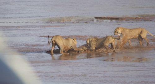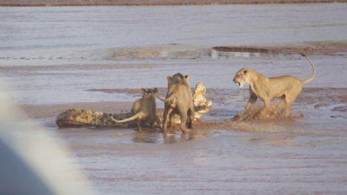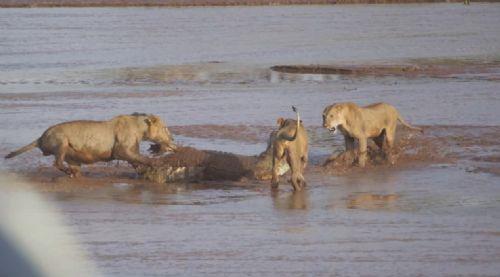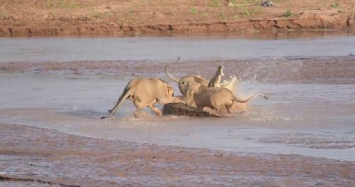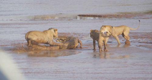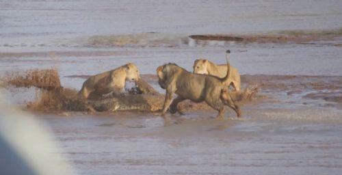 Kenya Samburu Milli Parkı'ndaki üç aslan acımasızca bir timsaha saldırdı.