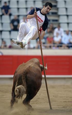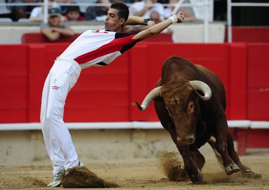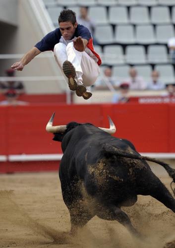 İspanya'nın boğaların üzerinden cesurca atlamak üzerine kurulu olan 'Recortador'lar, eski İspanyol geleneklerine uygun olarak kılıç ve pelerin kullanmadan boğadan kaçmaya çalışıyor.