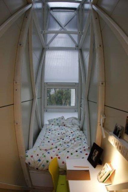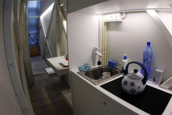 Sadece bir kişinin yaşayabileceği binada tek kişilik yatak, küçük bir mutfak ve banyo bulunuyor. Yemek masası ise iki kişilik
