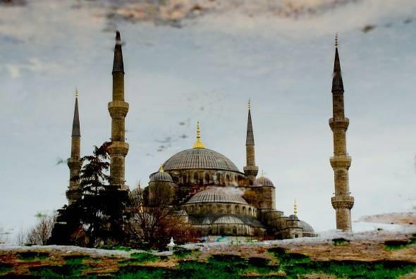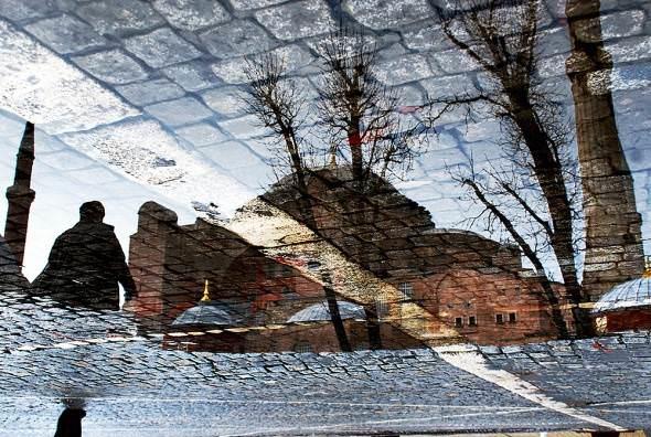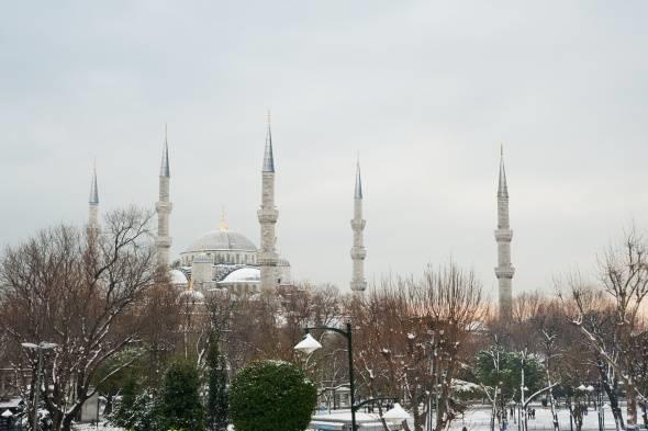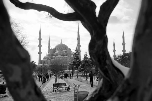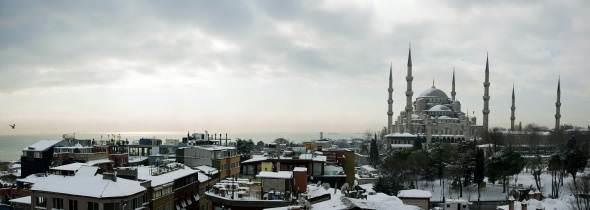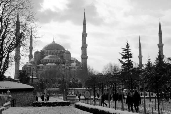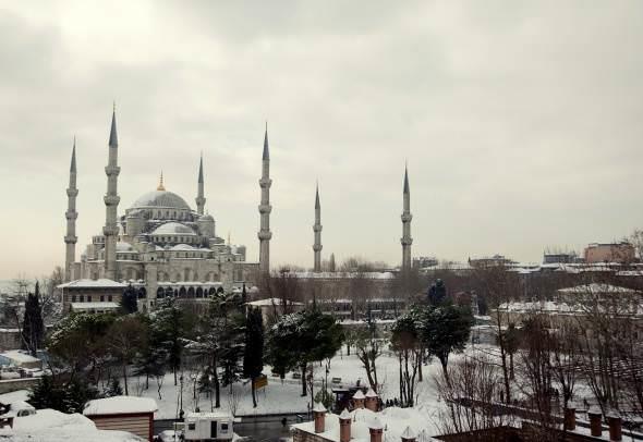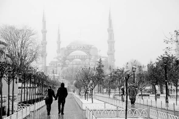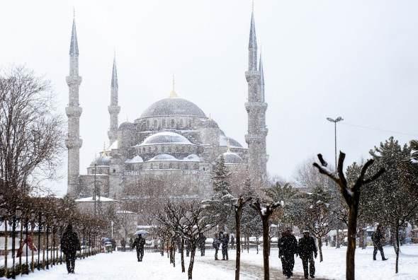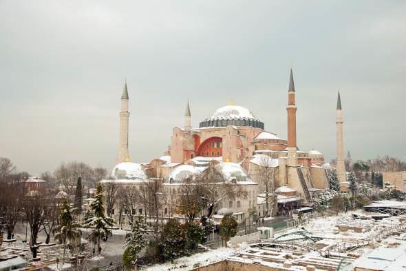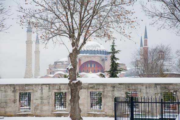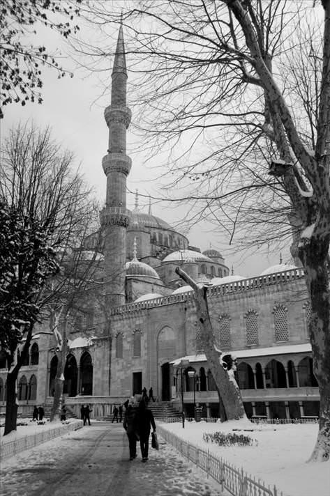 Karlar altında kalmış Ayasofya ve camiler, renklerin oyunu ve gölgenin yardımıyla görsel bir şölen sunuyor.