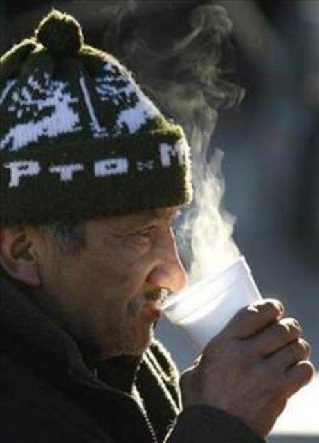Meksikalı evsiz bir vatandaş, yardım kuruluşunun dağıttı sıcak çikolatayı içiyor.
