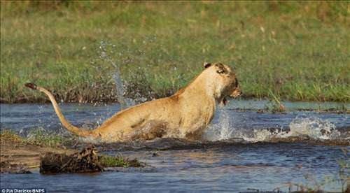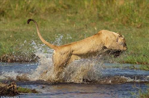Yavrusunu koruyan aslanın saldırısı Botsvana'nın Okavango deltasında bir anne aslan yolunun üstündeki gölden yavrularıyla birlikte geçecekti. Ama göldeki timsah yavrular için tehlike oluşturuyordu. -