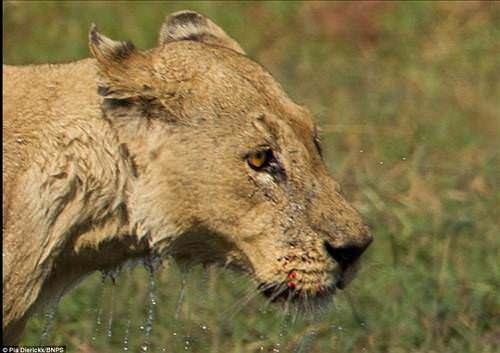 Anne aslan timsahı öldürdükten sonra adeta "kimse benim yavrularıma saldıramaz" der gibi etrafa baktı