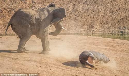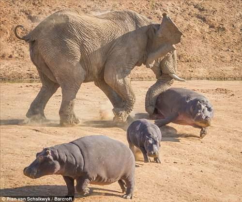 Fotoğrafçı Schalkwyk, anne su aygırının filin hışmından kurtulduğunu ve canını kurtardığını söyledi.