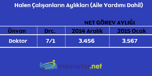 7'inci derecenin 1'inci kademesinde olan bir doktorun maaşı 3 bin 456 liradan 3 bin 567 liraya yükselirken, 1'inci derecenin 4'üncü kademesinde yer alan bir uzman doktorun maaşı ise 4 bin 187 liradan 4 bin 320 liraya çıktı.