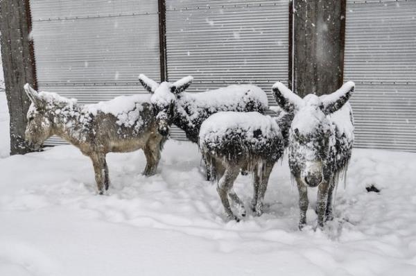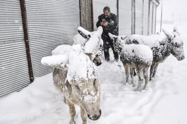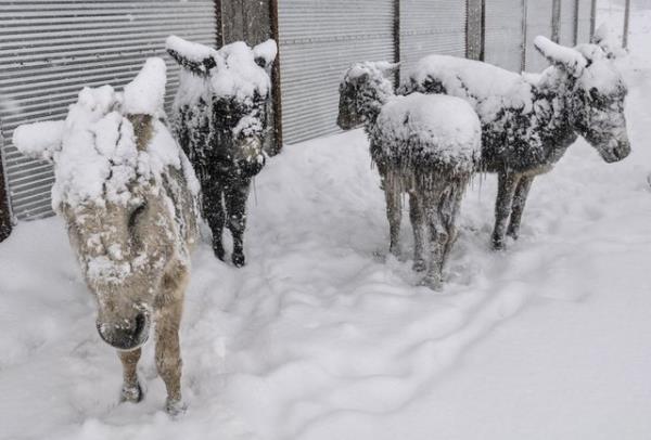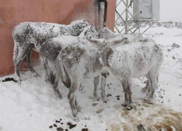 Şanlıurfa'nın Siverek ilçesinde etkini olan kar yağışı ve soğuk hava nedeniyle eşekler, kar ve buz tabakasıyla kaplandı