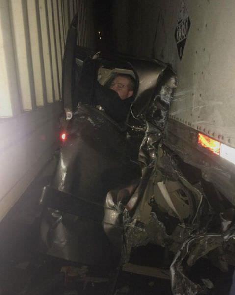 Çıkan feci kazada 27 yaşındaki Kaleb Whitby, Chevy Silverado Pickup aracıyla iki TIR'ın arasına girince aracı paramparça oldu.