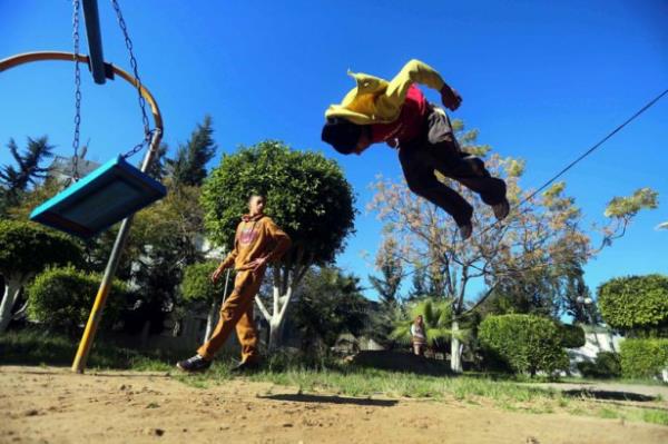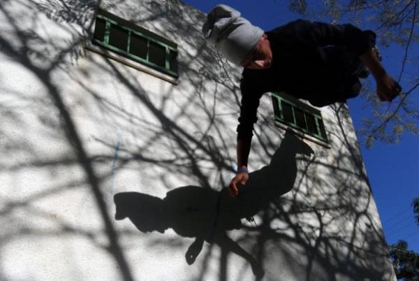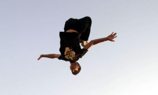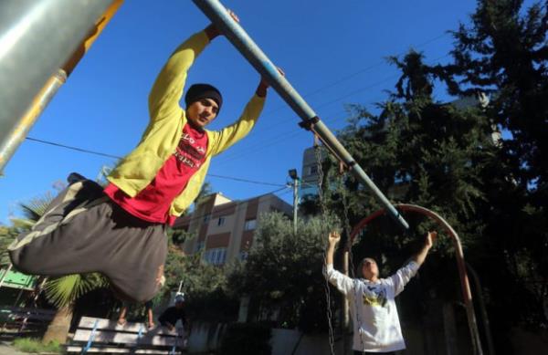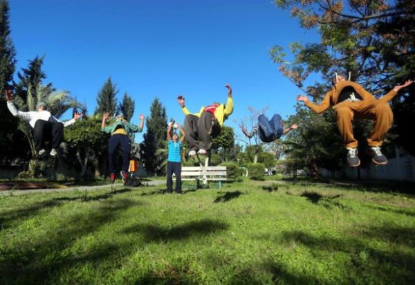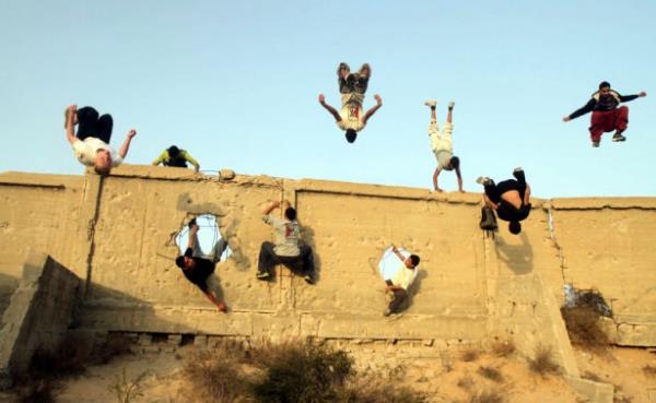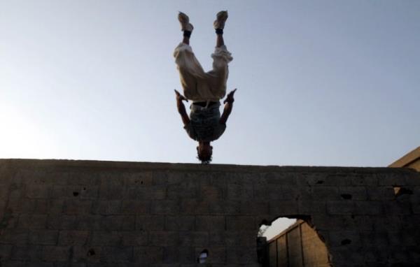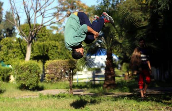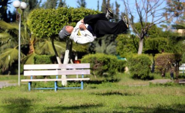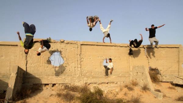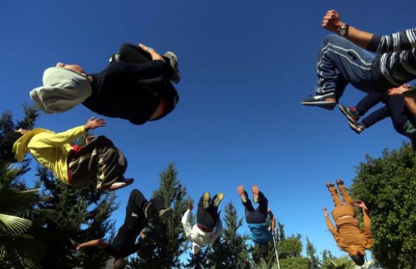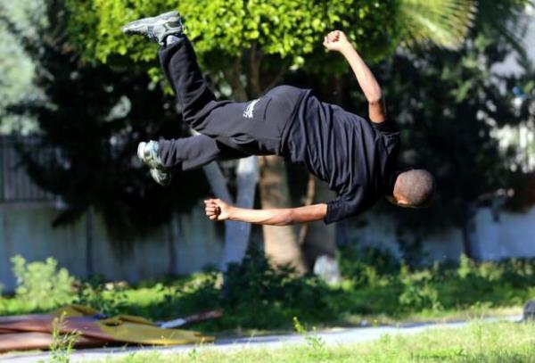 Gazze'deki Filistinli gençler, insan vücudunun yeteneklerini verimli şekilde kullanıp, bir noktadan başka bir noktaya hızlı ve etkili biçimde hareket etmesini hedefleyen bir beden eğitimi olan Parkur sporunda hünerlerini sergiliyor.