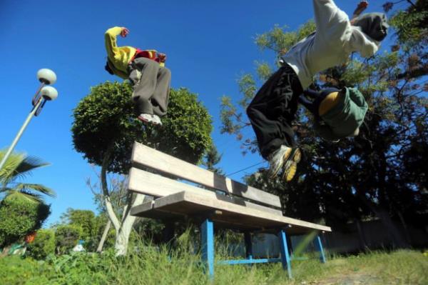 Gençler, zorlu engellere aldırmadan akrobatik atlayışlar gerçekleştiriyor.