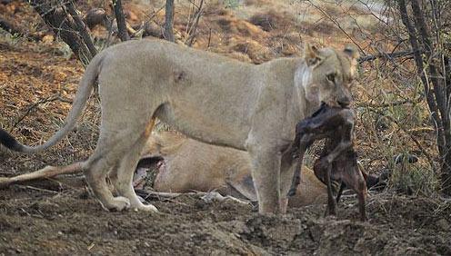 Ceylanın karnından yavaşça yavruyu çıkaran aslan, ceylan yavrusunun üzerinde bulunan atıkları dakikalarca yalayarak temizledi.