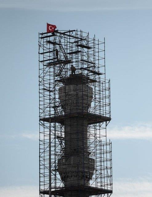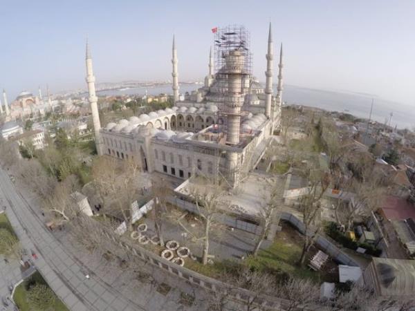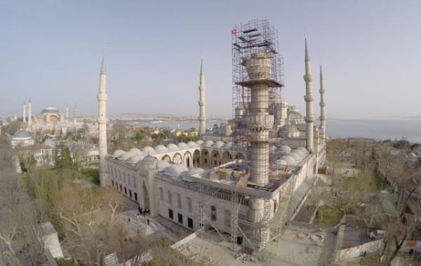 İstanbul’da 1616’da yaptırılan 6 minareli Sultanahmet Camisi’ni inceleyen Vakıflar Genel Müdürlüğü, kayma nedeniyle can güvenliğini tehdit eden bir minareyi restorasyona aldı.