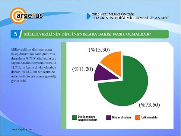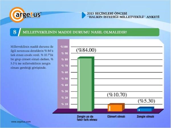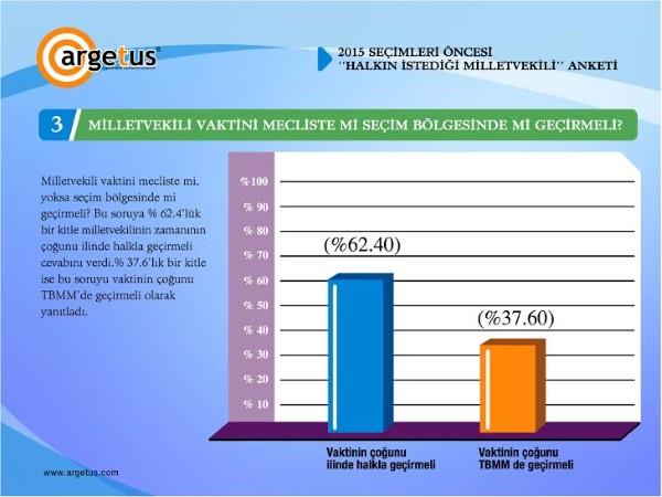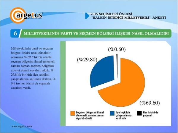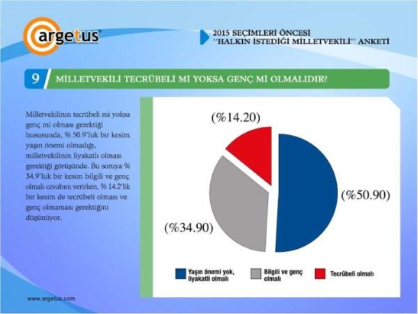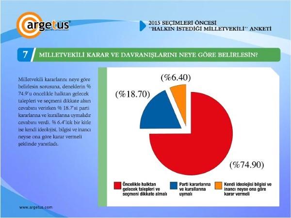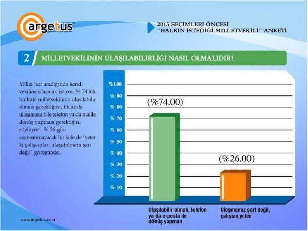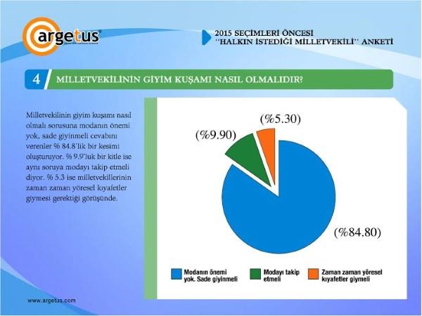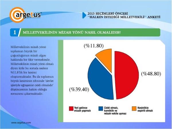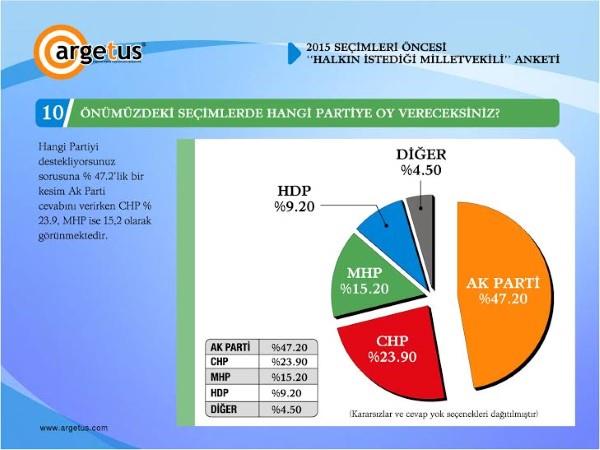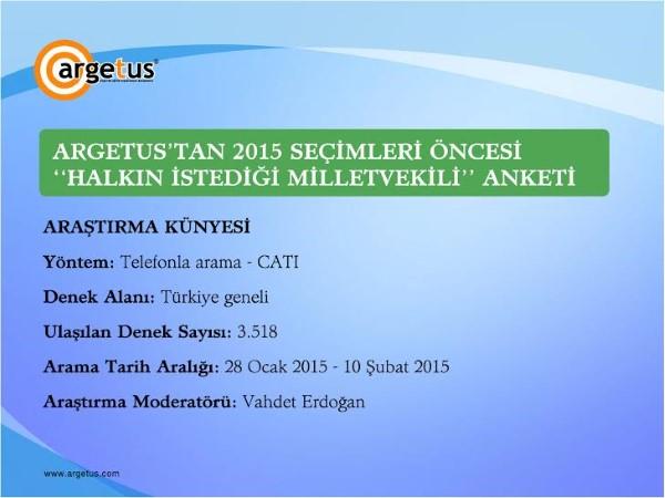 ARGETUS Araştırma Grubu, 2015 seçimleri öncesinde ‘Halkın istediği milletvekilinin temel özellikleri nelerdir?’ sorusunun peşine düştü. Ülke genelinde telefonla ulaşılan 3 bin 518 kişiye mizah, moda, kıyafet seçimi, zenginlik-fakirlik, gençlik-tecrübe, teşkilat ve seçmenle ilişkilerle ilgili çeşitli sorular soruldu. Seçmene yöneltilen sorular arasında “Seçimlerde hangi partiye oy vereceksiniz?” sorusu da yer aldı.