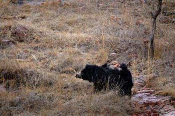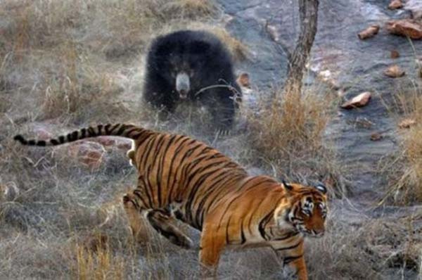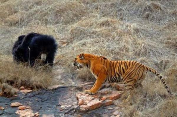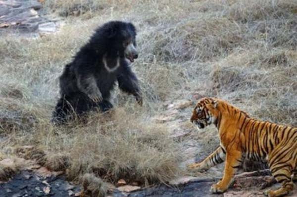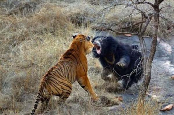 Ormanlık alanda karşı karşıya gelen kaplanla ayı birbirine girdi.