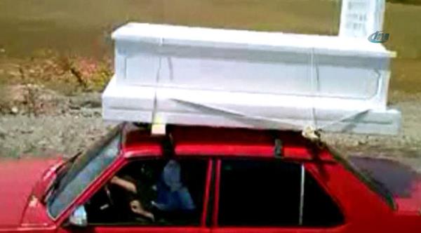 Otomobilin üzerinde taşınan mezar karısında görenler, "Mezar yola düşmüş" esprisini yaptılar.