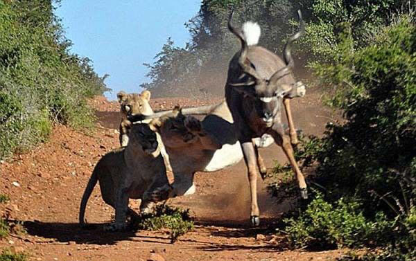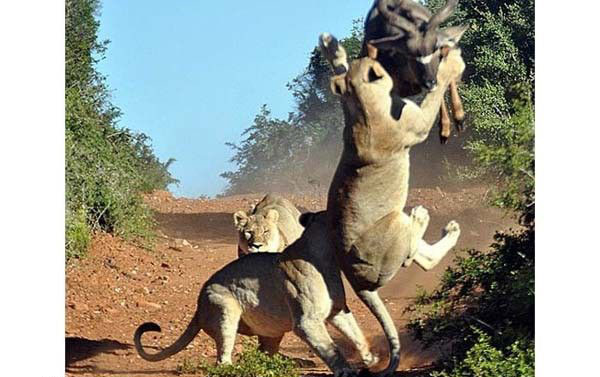 Ancak savunmasız olduklarını düşündükleri avı, üç aslanla karşılaştığında bir anda neredeyse iki metre yükseğe sıçrayıp, kendisini bekleyen avcıların pençelerinin arasından ve üzerinden geçmeyi başarıyor.