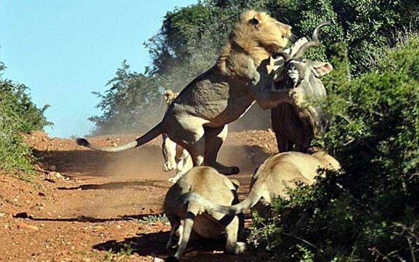 Güney Afrika'da çekilen fotoğraflar, aslanlardan birinin antilobu önüne katıp, diğerlerinin üzerine doğru kovalarken, diğer üç aslanın da üzerlerine gelecek olan avı alt etmek için sabırla beklediğini gösteriyor.