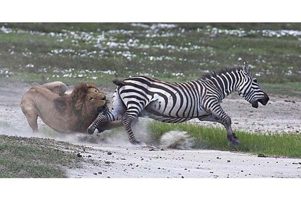 Bir yandan kaçmaya çalışan zebra diğer yandan arkasındaki aslana çifte attı.